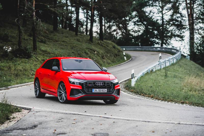 Electronically controlled air suspension with a continuously adaptive damping system – adaptive air suspension or adaptive air suspension sport (standard equipment on the SQ7 TFSI) – are included. Depending on the driver’s preferences and the driving situation, the suspension adjusts the ride height by up to 90mm while also offering level control. On the highway, the suspension lowers automatically by up to 30mm, depending on the current speed, and by 15mm with adaptive air suspension sport. During off-road driving, the “Lift” function in Audi drive select can be used to increase the ground clearance by up to 60mm at low speeds.